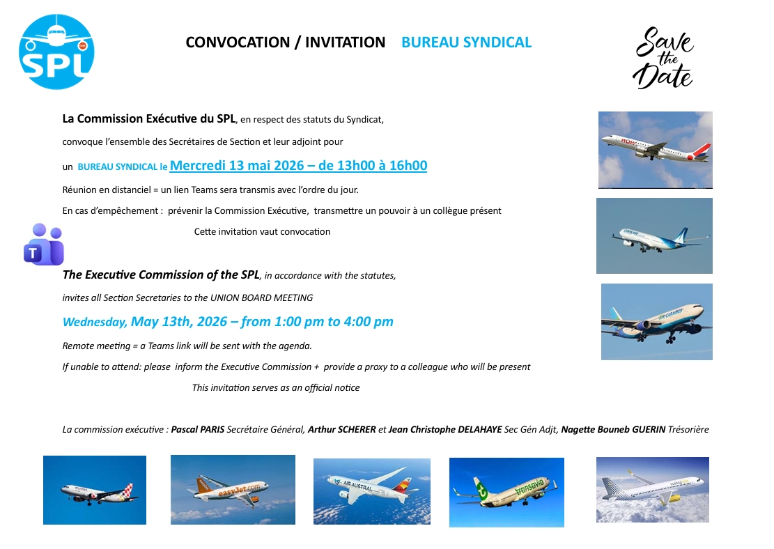 Au SPL, on considère que les conditions de travail de tous les salariés doivent être en cohérence quelle que soit la catégorie des personnels. Bien évidemment notre syndicat traite en priorité les problèmes de Pilotes mais notre expérience acquise depuis près de dix années favorise la réflexion commune avec nos collègues PNC et sol.